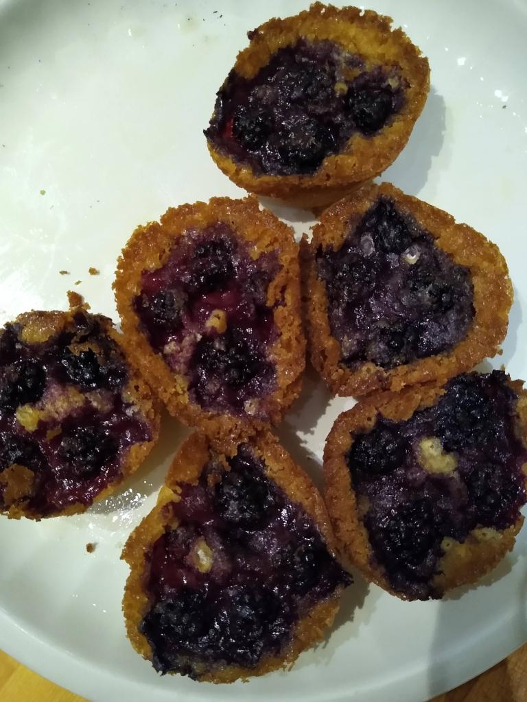 Butter a 12 hole muffin tin (I find my standard metal one works best) and put the oven on at 180C. Melt the butter (I use the microwave on defrost, so it doesn’t splatter). Then mix the sugar, flour and milk to make a batter, and then the melted butter. Distribute the batter in the muffin tin – the holes will be almost full to the top. Then put the blackberries on the top of each cobbler – my blackberries were enough for 4 per cobbler.