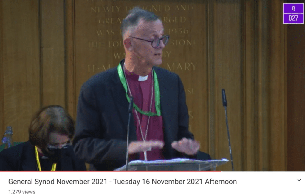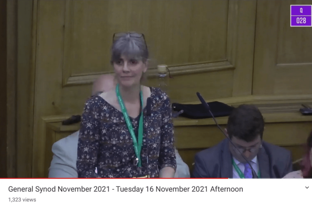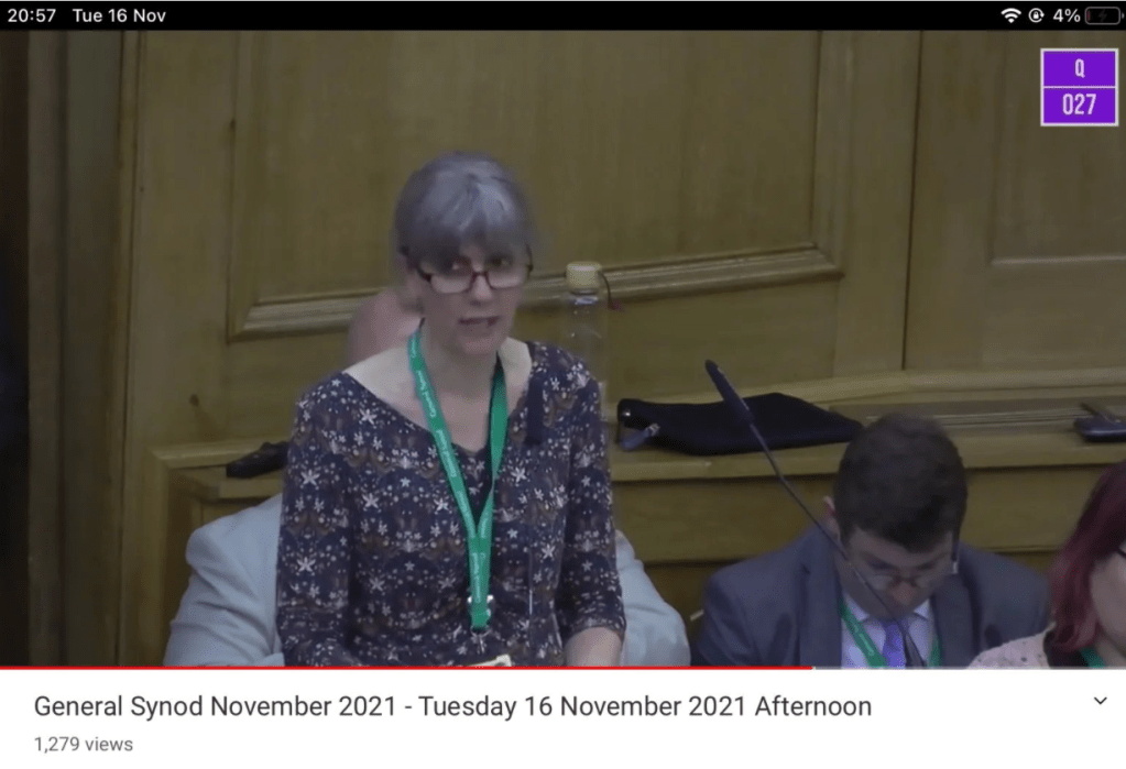 I asked two written questions – numbers 27 and 28, both about the Clergy Discipline Measure. You can hear me jumping up to indicate that I had a supplementary question (and asking it, then taking a breather, then laughing as I ask another, because I’d forgotten I had a second one) on the CofE YouTube channel (this link will take you to the start of my section, and the Bishop of Worcester answering). I don’t think that my questions generated much light, but hopefully some issues were highlighted to the team responsible for revising the undeniably appalling existing system of clergy discipline.