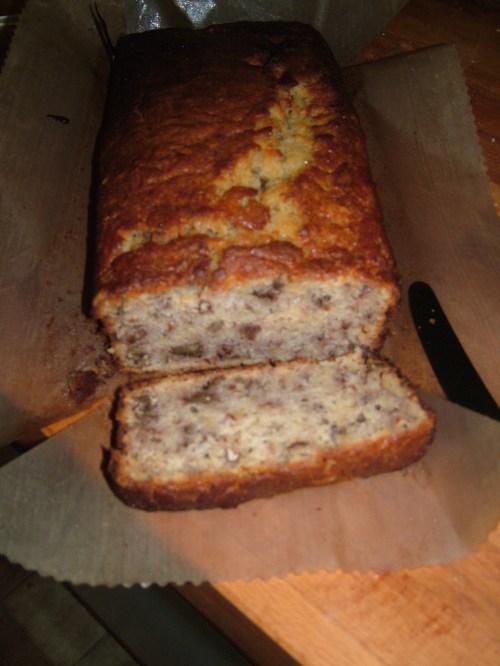 Wildwoman is a big foodie and thought I should would enjoy Bill’s food, which I did, very much. This cake has become a staple in our house, where we always seem to have some overripe bananas attracting fruit flies in the corner of the kitchen.