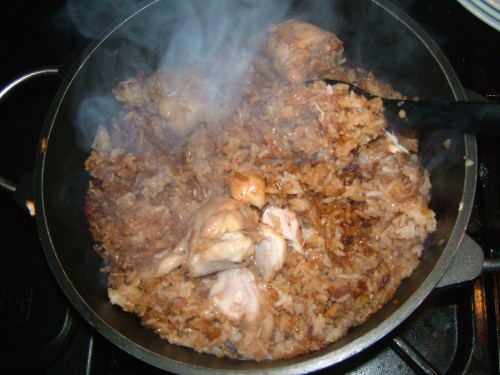 Once all the water is absorbed into the rice, pop the chicken pieces and the marinade on top, together with the vegetable oil. Cover the pot again and leave it to cook on a low heat for 20 minutes. Don’t open the lid, as this will prevent the chicken from cooking thoroughly, as it steams on top of the rice.