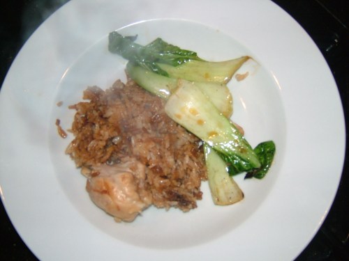 After 20 minutes, open the lid and get a spoon and mix the chicken into the rice. You should find that some of the rice at the bottom of the pan has gone all crispy. Mmmm. Replace the lid and cook for a further 15 minutes on a low heat. Whilst this is going on, you might want to cook some veg. It was Bok choi (with garlic, soy sauce and a little sugar) for us last night.