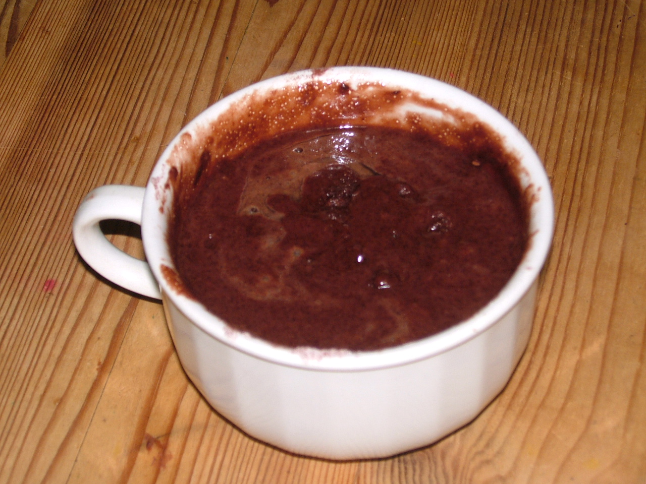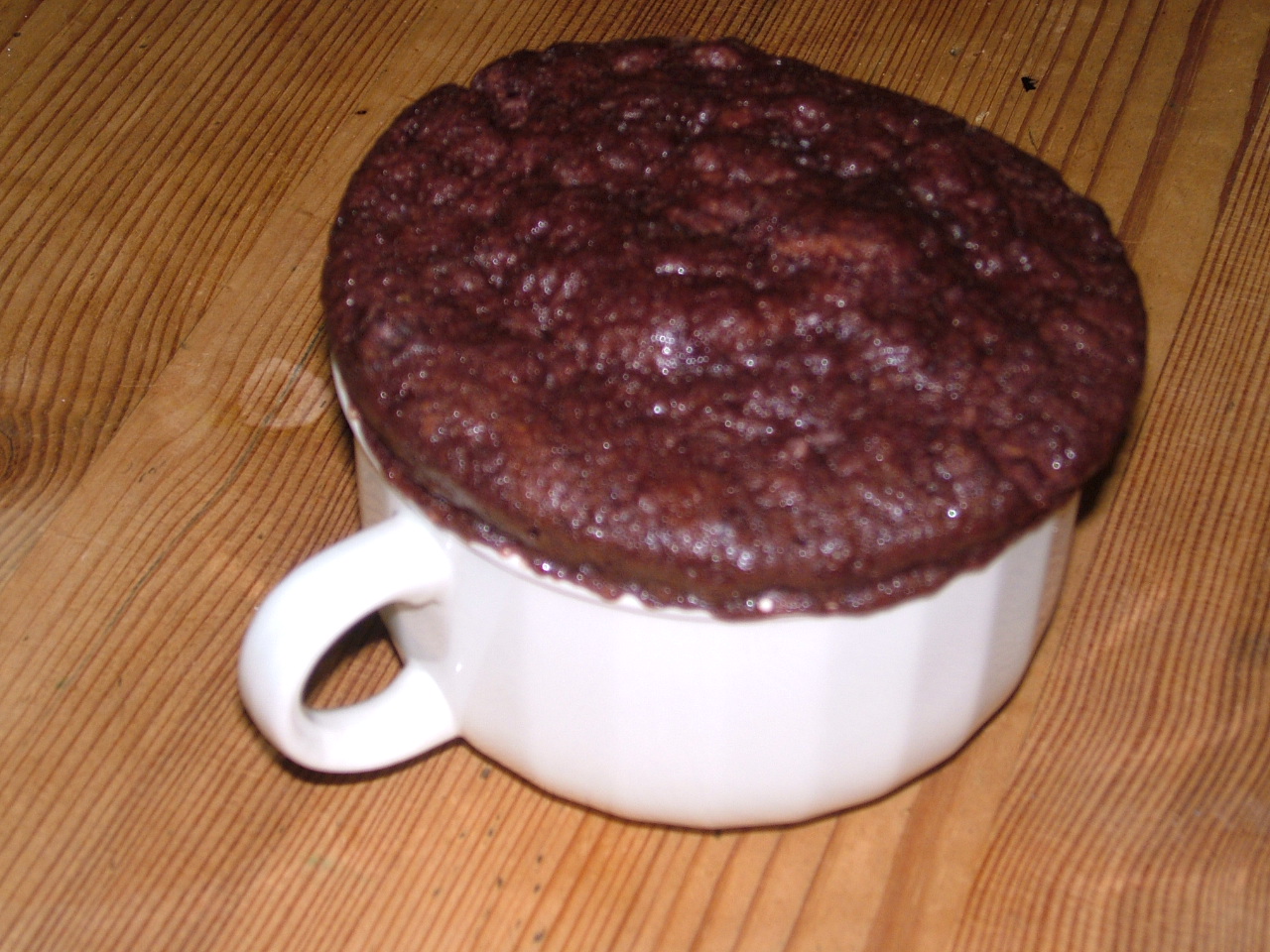 The recipe was originally titled ‘3 minute brownies’ but what you get is more like a hot sponge pudding. Although it takes about 3 minutes in the microwave, total production time was rather longer – a whopping ten minutes for two of them, I reckon. A perfect pause time between courses, actually.