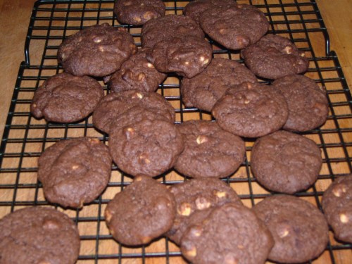 To bake them I line 3 baking trays with reusable silicone liners (you can use baking paper or grease your trays well) and use two teaspoons to make walnut-sized blobs of mixture. I can make about 40 standard biscuit-sized cookies from a single batch of this mixture. Bake them for 12-15 minutes at 180ºC (Gas 4, Fan 170ºC), until they have turned golden (you can only see this when they don’t have cocoa in them!) and have risen. They will flatten out again and harden a little whilst cooling – wait a few moments before transferring to cooling racks with a palette knife. If you slightly undercook them you can get a chewy cookie texture, or leave a little longer for a crunchier bite.